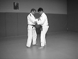 Uke steht mit seinem rechten Bein vorne. Bewegt vorgetragen würde dies der Zeitpunkt nach absetzten des Fußes sein. Tori setzt
