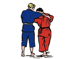seitlich hinten an Ukes rechtem Bein ein. Tori läßt sich fallen und reißt Uke mit sich.
