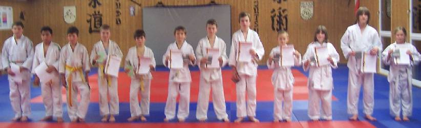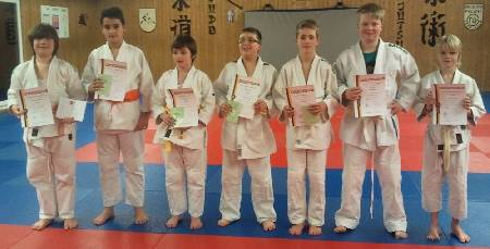 Hermann Mayer freut sich über den grünen Gürtel (3. Kyu), Miguel Schwenk und Nils Hoyler tragen jetzt Orange (5. Kyu), Nikita Boguduschko und Jan Hoyler Gelb-Orange (6. Kyu), Tobias Bauch, Kevin und Christian Schaible haben die Prüfung zum Gelb-Gurt (7. Kyu) bestanden und ihre erste Kyu-Prüfung zum weiß-gelben Gürtel (8. Kyu) haben erfolgreich absolviert: Rafael Antoniadis, Alena Möbus, Marian Thomas und Luisa Chaberny.