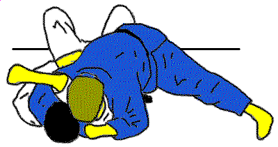 Uke liegt auf dem Rücken und hält seinen rechten Arm über sein Gesicht. Tori legt sich auf den Bauch