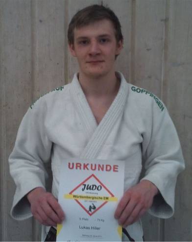Gleich im ersten Kampf hatte Lukas mit Max Bschlangaul vom TV Vaihingen eine hartes Los. Mit druckvollem Kampf schaffte er eine Yuko-Führung, wurde aber 8 Sekunden vor Kampfende nach einem etwas optimistischen Angriff gekontert und in die Hoffnungsrunde verwiesen. Dort gewann er gegen Christoph Hanke vom JZ Heubach und gegen Dirk Kittelberger vom JV Nürtingen. Das kleine Finale verlor er aber und muss so auf die Nominierung zu den Süddeutschen Meisterschaften im München durch den Landestrainer hoffen.