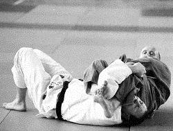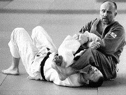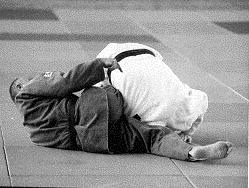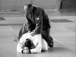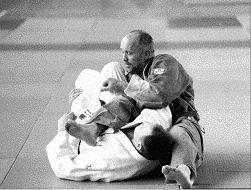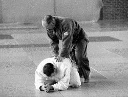 Eine Unterrichtseinheit von Ulrich KlockeUlrich Klocke zählt zu den namhaftesten deutschen Judo-Pädagogen. Durch seine fachlich hochwertigen Veröffentlichungen, seine exzellenten Judofotos, aber auch seine kritischen Thesen zu aktuellen Themen des Judosports belebt er die "Judolandschaft". Noch immer "brennt" er für den Judosport, dem er als Trainer und aktiver Breitensportler verbunden ist. Hier ein Ausschnitt einer Technikstunde, die Ulrich 1995 bei der Internationalen Judo-Sommerschule in Lindow:Abb. 1 und 2 Der Partner hat sich in der Bankposition “eingeigelt". Ulrich greift von schräg hinten an, belastet ihn und steigt mit einem Bein über Uke (hier das rechte). Er schiebt dieses Bein weit durch in die Lücke zwischen Ellenbogen und Knie. Der Fuß schaut auf der anderen Seite wieder heraus. ![]() ![]() Abb. 3 und 4 Ulrich stützt sich mit Kopf und rechter Hand ab. Den linken Arm schiebt er vom Kopf des Partners her kommend zwischen Oberarm und Körper hindurch und legt die linke Hand auf den rechten Oberschenkel.